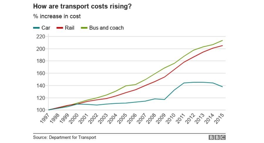There is unfairness in the costs of various forms of transport, and it’s getting worse each year. This graph comes from the BBC (the car line is the one at the bottom):