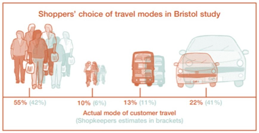 - Shopkeepers consistently overestimate the share of their customers coming by car. In some cases, this is by a factor of as much as 400 per cent.