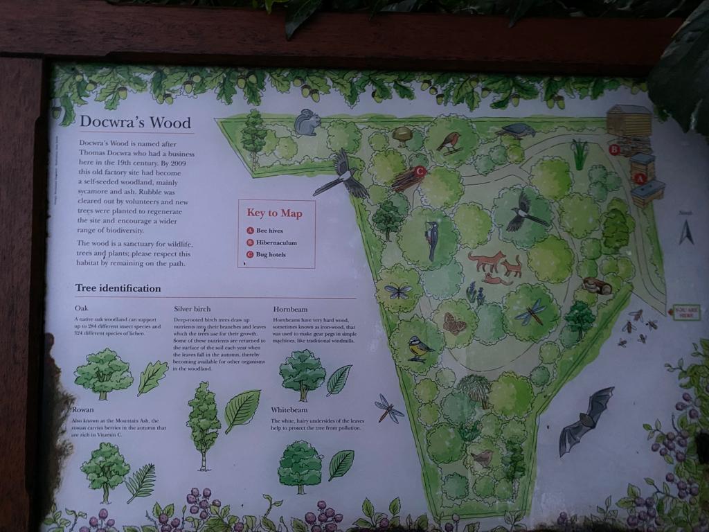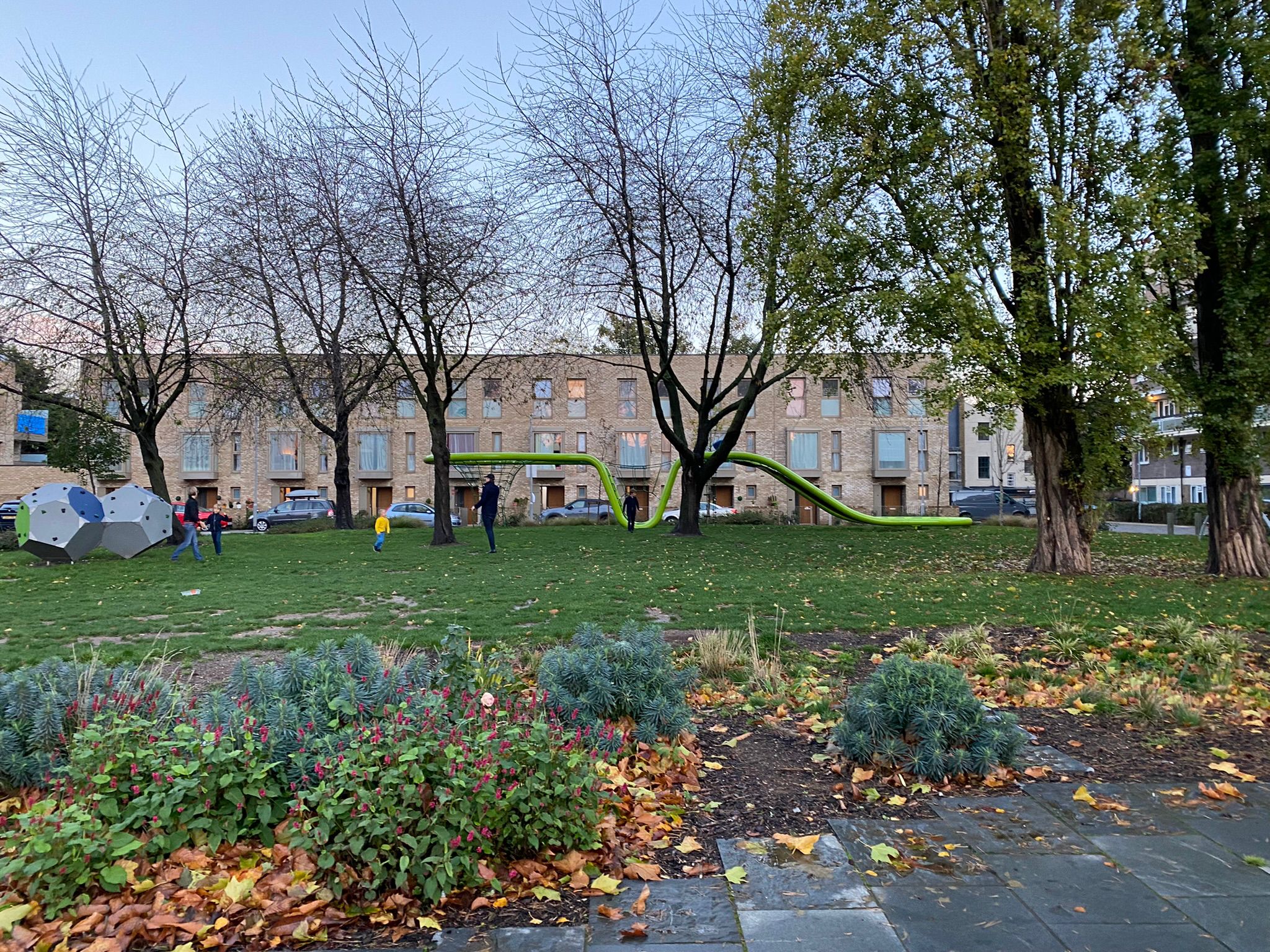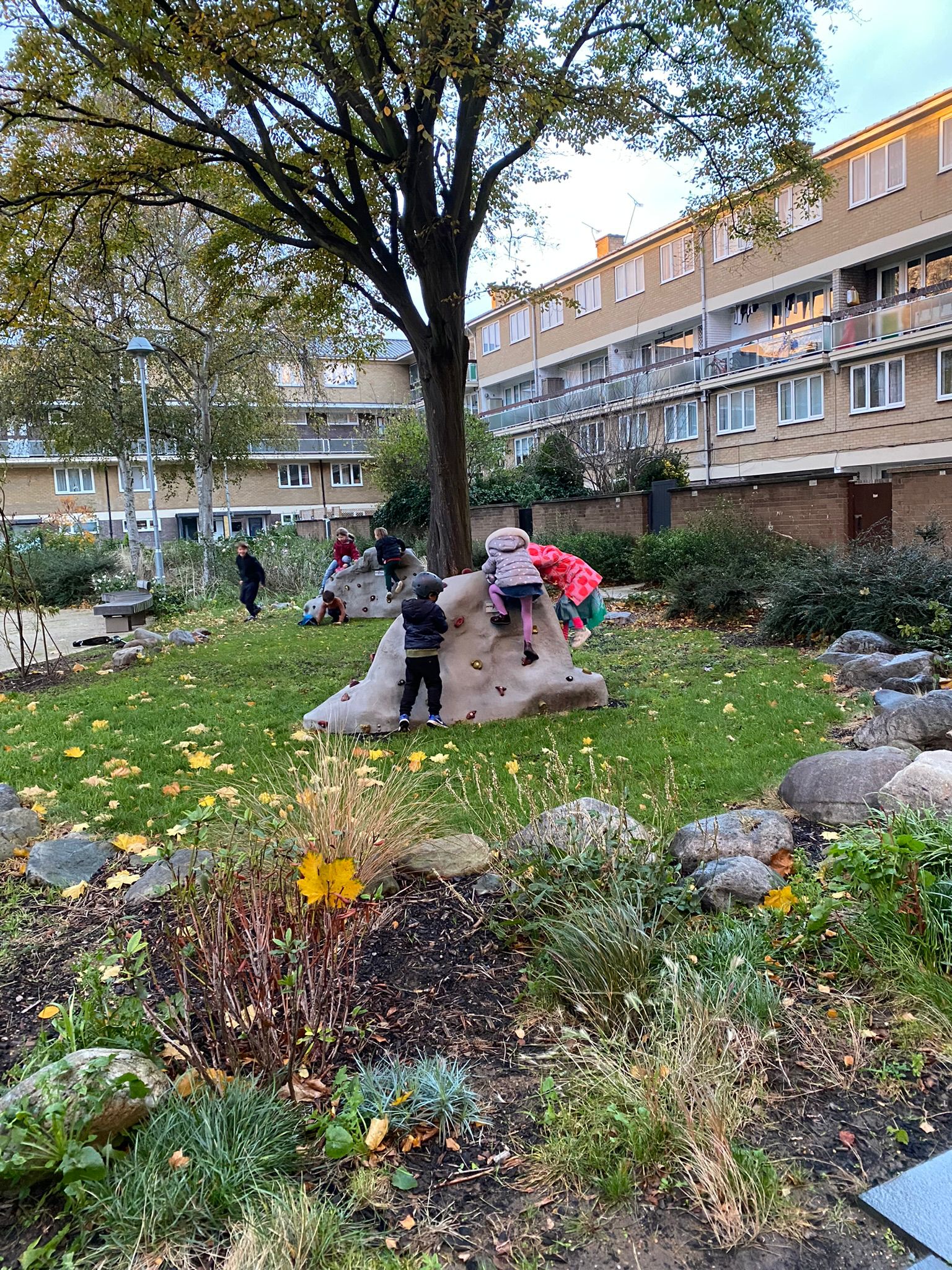 We stopped off in a hidden playground at Nightingale Park, then continuted as our I Spy game finding stone pelicans, a commerative plaque and some well-cared-for tree pits. Finally, we entered the Dover Court estate, where we were greeted by a wonderful redesigned green open space. The children’s faces lit up as they spotted the climbing rocks and the most amazing green slide. The area was filled with trees and shurbs.