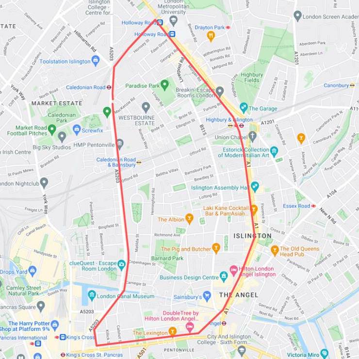 We think that the future Barnsbury & St Mary's LTN covers the area between Upper Street/Holloway Road and the Cally (East to West), and between the Piccadilly train line at Hornsey Street and Pentonville Road (North to South). Here's a handy (speculative) map: